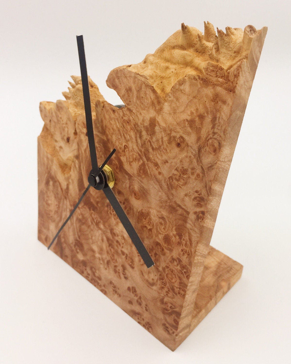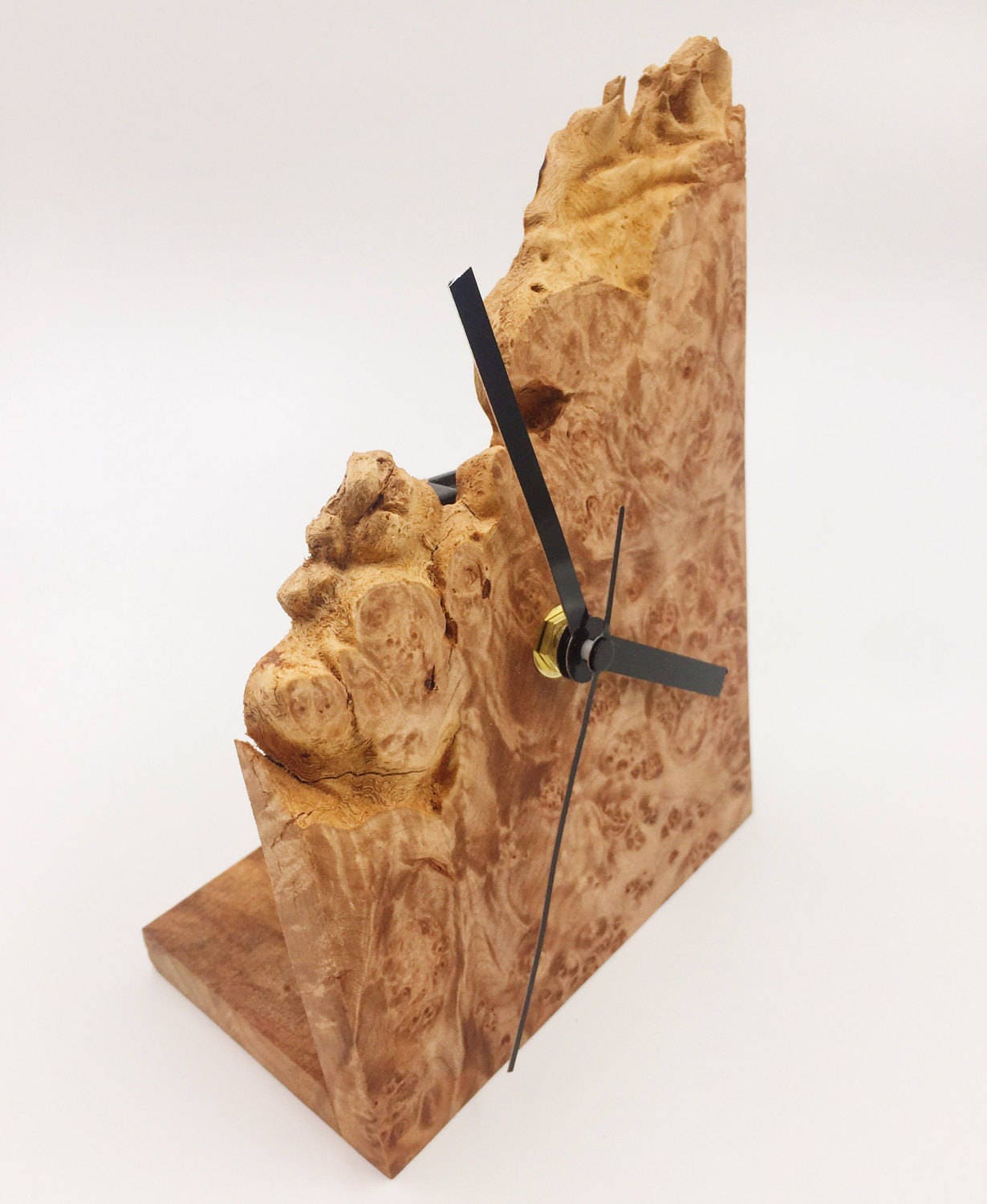Live edge maple burl desk clock. Finished with a matte polyurethane. Clock is battery powered and free standing. Sweeping second hand.